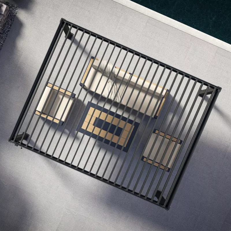 Pergola Bumbung Louver Boleh Laras Vionta mempunyai struktur aloi aluminium berkekuatan tinggi dan reka bentuk louver yang boleh ditarik balik. Dengan melaraskan sudut cahaya matahari melalui sistem mekanikal ketepatan, ia mencapai pengalaman luar yang ideal dengan cahaya matahari yang boleh dikawal, pengudaraan yang lancar dan perlindungan hujan yang boleh dipercayai. Ia bukan sahaja pelindung matahari, tetapi juga sistem kediaman luar yang pintar, fleksibel dan tahan lama yang membolehkan anda menikmati masa luar sepenuhnya 365 hari setahun.