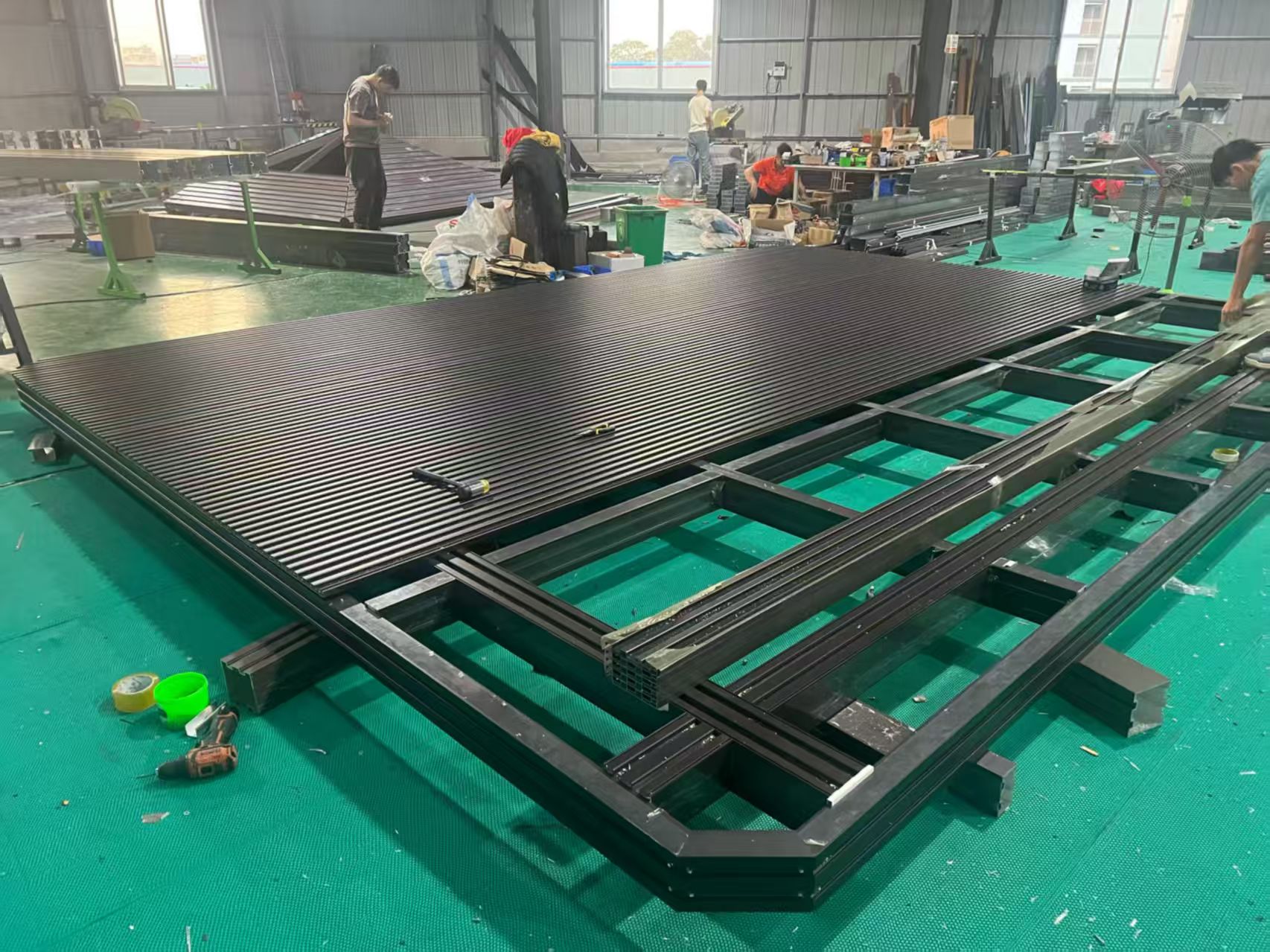 Profil aluminium pra-siap dengan permukaan bersalut serbuk, memberikan mereka rupa yang bersih sambil meningkatkan ketahanan luaran. Selepas bingkai diikat, panel louver diletakkan satu demi satu. Pekerja menyemak jarak, kelurusan dan kesesuaian semasa mereka pergi, bukannya menunggu sehingga tamat. Ia adalah proses yang mudah, tetapi perhatian terhadap perincian di sini menjadikan pemasangan lebih lancar kemudian.