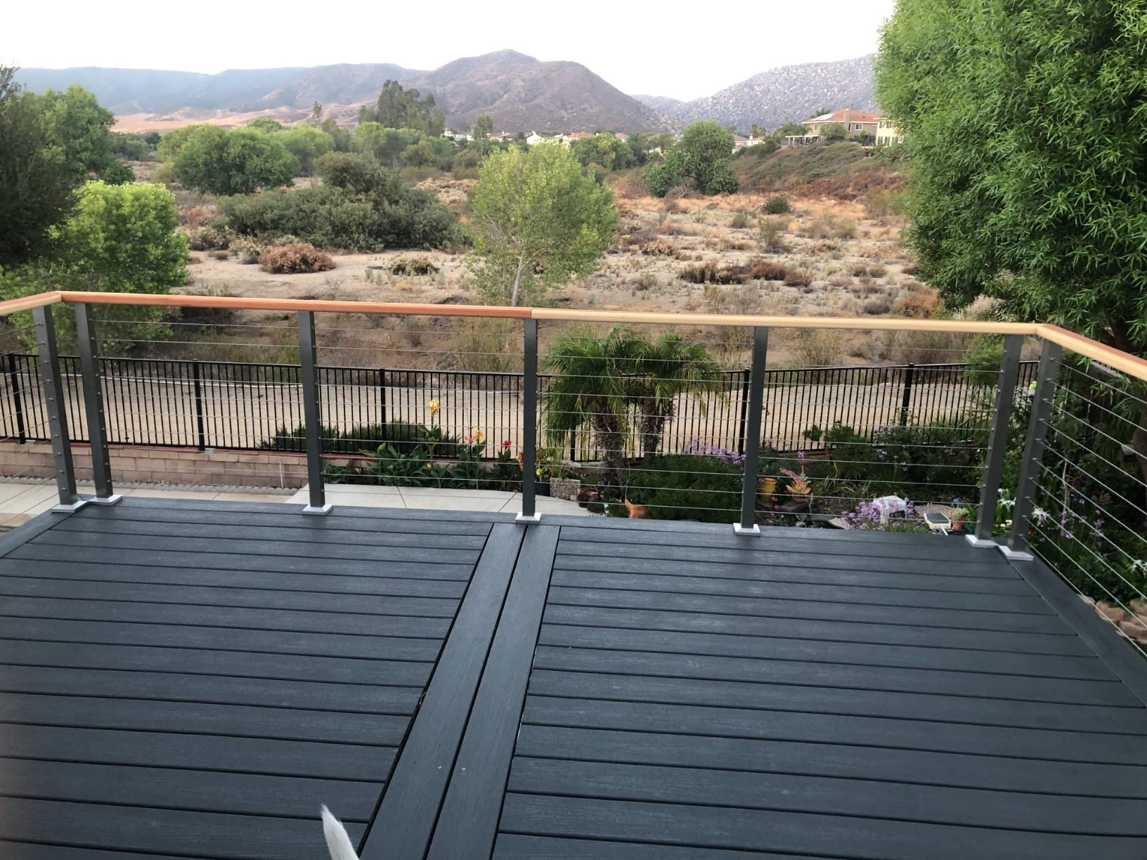 Sistem pagar kabel menggunakan kabel keluli tahan karat dan bukannya baluster tradisional, menawarkan reka bentuk minimalis dan kontemporari.