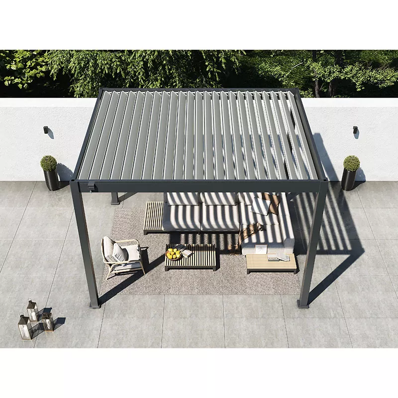 Pergola louvered luar Vionta diperbuat daripada aloi aluminium berkualiti tinggi, menjadikannya bukan sahaja kukuh dan tahan lama tetapi juga boleh disesuaikan dengan pelbagai iklim—mengekalkan kekukuhan dan keindahannya walaupun di bawah cahaya matahari dan hujan yang terik, kekal berfungsi dan menyenangkan dari segi estetika selama bertahun-tahun. Ia bukan sahaja memberikan naungan dan perlindungan tetapi juga menggalakkan aliran udara melalui reka bentuk pintarnya, membolehkan anda menikmati ruang yang segar dan selesa di luar.